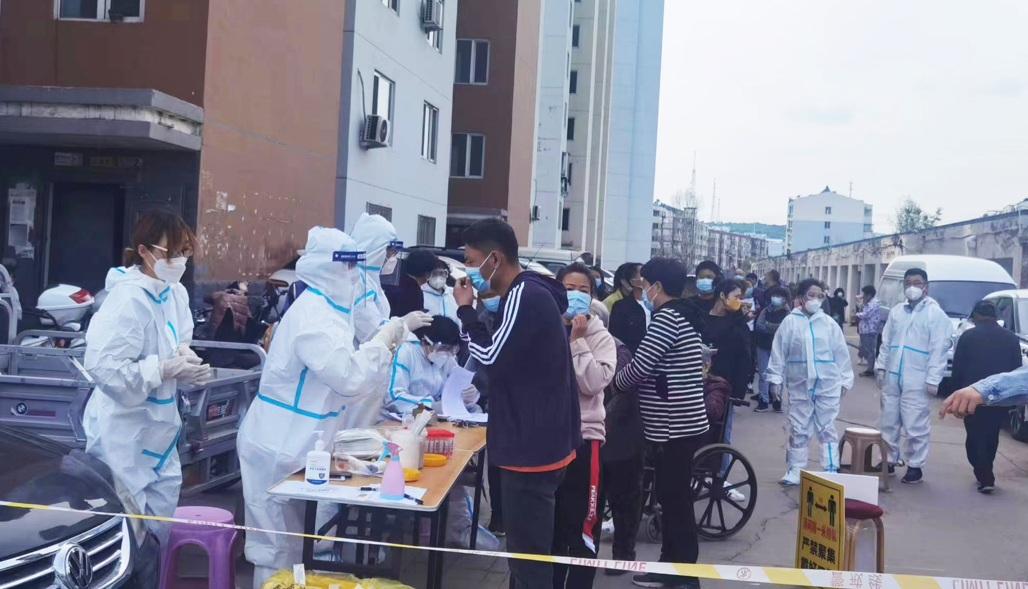 “穿上防護(hù)服成為‘大白’,感到非常光榮,也感到責(zé)任重大?!苯诔械職鉁厣撸瘓F(tuán)公司許平凡、紀(jì)哲負(fù)責(zé)維護(hù)秩序、信息錄入,每天穿著密不透風(fēng)的防護(hù)服、戴著醫(yī)用口罩及手套,里面衣服被汗水浸透,手被捂得發(fā)白,鼻梁被口罩壓出瘀痕,平時(shí)顯得厚實(shí)的腳套,每天都被磨破兩三雙,一刻不停的指揮居民排隊(duì),逐樓的通知居民下樓核酸,嗓子都喊啞了,也從沒有喊過累。