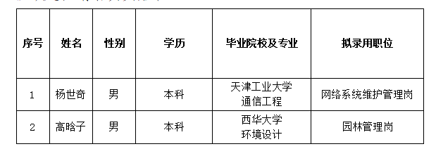根據(jù)2023年度承德市國瑞置業(yè)有限責(zé)任公司公開招聘工作人員的相關(guān)要求,經(jīng)過筆試、面試、體檢和考察等程序,確定楊世奇、高晗子2名同志為承德市國瑞置業(yè)有限責(zé)任公司擬錄用工作人員,現(xiàn)予以公示?,F(xiàn)對擬錄用人員信息進行公示,公示期間如有異議,可通過電話、信函等方式反映,反映意見請署真實姓名。